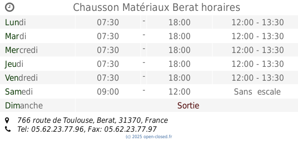 Add it to your website, your phone or even your desktop - opening times, phone numbers and the road to Store of the Chausson Matériaux Dans Berat, 766 route de Toulouse.